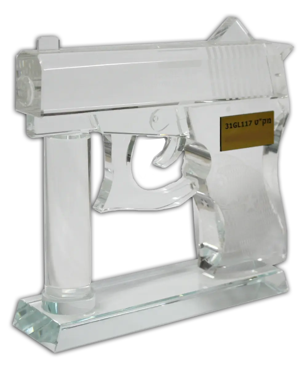 מעמד אקדח זכוכית קריסטל רוחב: 18 ס”מ, גובה: 17 ס”מ.