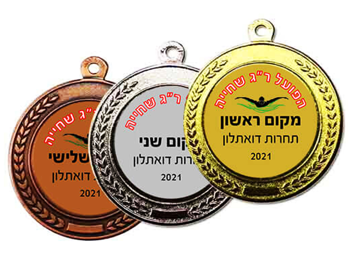 מדליות 50 מ”מ זהב כסף וארד, דגם אצילי ניתן לשלב עם מדבקת 36 מ”מ.