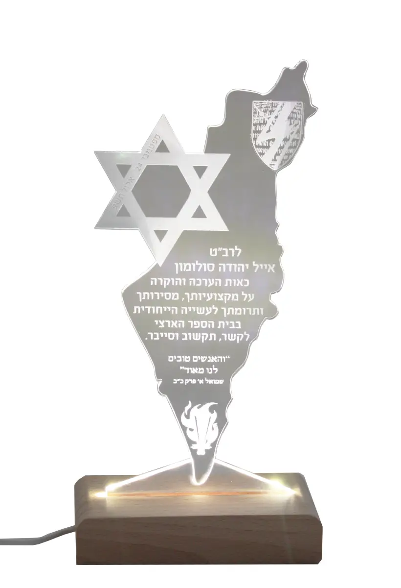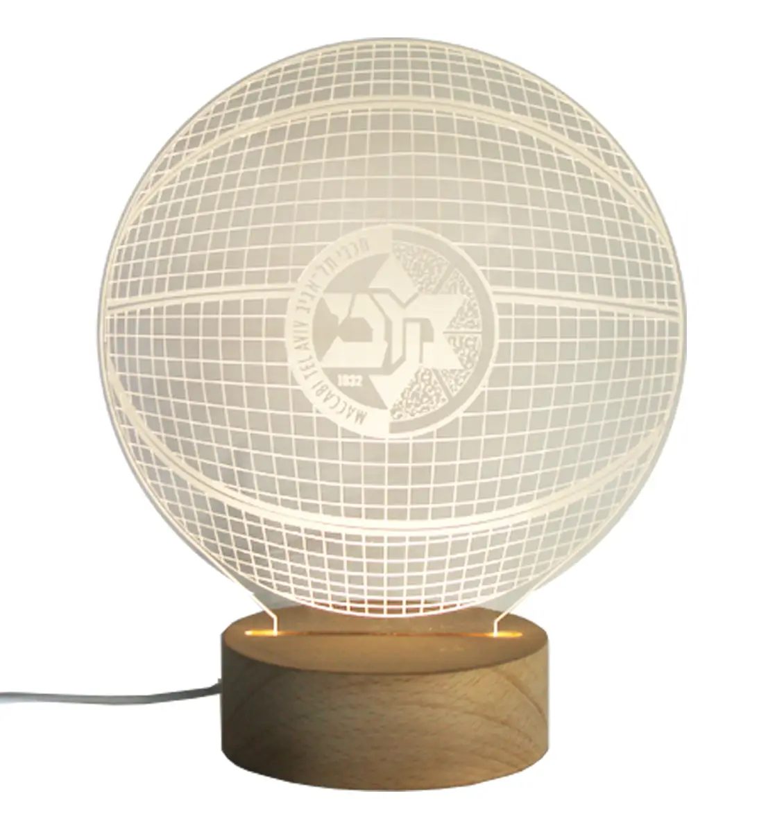 מנורת לד בחיתוך פרספקס צורני ובחריטת לייזר.