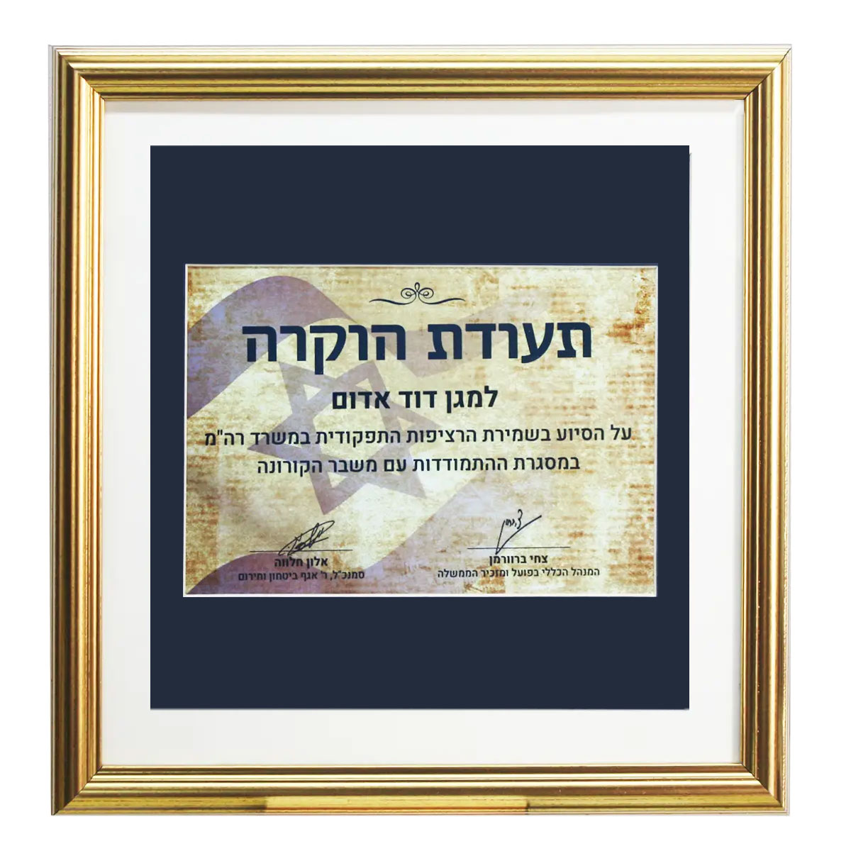 תעודת הוקרה בשילוב מדליות. מידות: 32/32 ס"מ.
